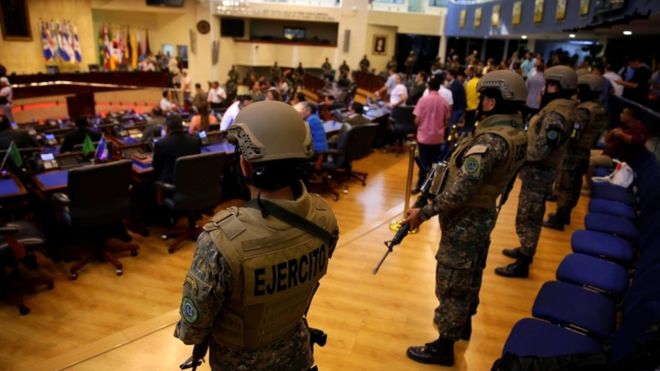 - Y lo aún más repudiable es la militarización, toma violenta y “profanación” del recinto legislativo por parte del Presidente Bukele y sus secuaces. Las imágenes de soldados y policías invadiendo el salón azul retraen el pasado dictatorial y represivo que la democracia milenial del Presidente busca reeditar. El “performance” bukeliano incluyó una flagrante violación al carácter laico del Estado: el Presidente se comunicó con Dios, superando al mejor estilo de la presidenta golpista boliviana Jeanine Áñez quien entró con la Biblia al palacio de gobierno.