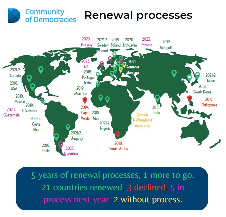 The Permanent Secretariat had informed the Pillar that Argentine Republic, the Republic of Estonia, the Republic of Guatemala, the Kingdom of Norway and the United Kingdom of Great Britain and Northern Ireland submitted the letters of intent regarding the renewal of commitment to membership of the Governing Council of the Community of Democracies.