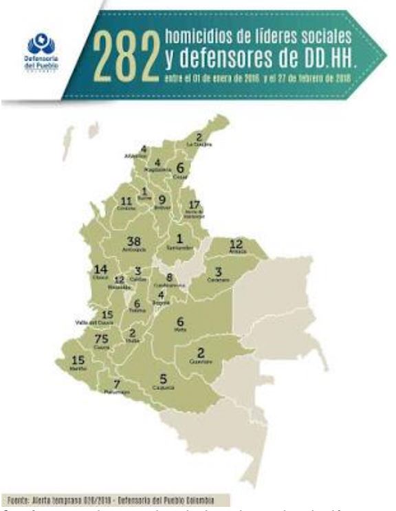 Según un informe de las organizaciones colombianas Instituto de Estudios para el Desarrollo y la Paz (INDEPAZ), Cumbre Agraria y Marcha Patriótica, en lo que va del 2018 casi un centenar de líderes sociales y defensores de derechos humanos han sido asesinados. Cifra que va en aumento y por lo cual gran parte de la sociedad civil está pidiéndole al gobierno y autoridades competentes tomar cartas en el asunto. Sobre todo si tenemos en cuenta que esta ola de violencia no es reciente, sino que empezó en el marco de la firma de los acuerdos de paz con la guerrilla de las FARC, hoy desmovilizada, como lo denunciamos el año pasado también por medio de una alerta. Desde entonces más de 200 personas han sido asesinadas, alguna fuentes hablan de casi 300.